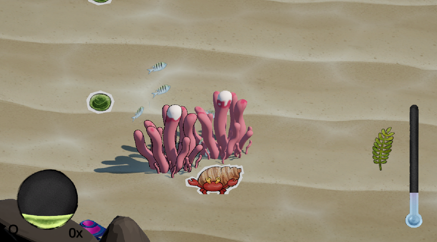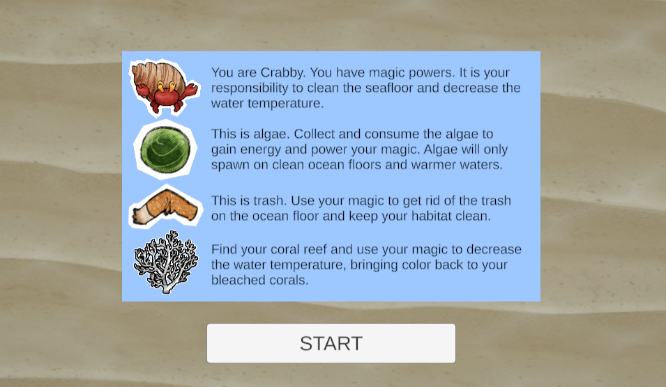 Can you restore the reef? Play as Crabby, a hermit crab with magical powers that can lower water temperatures that are on the rise due to climate change. Collect algae to restore your energy, power your magic, and protect the reef from harmful algae blooms. Use your magic to clean the reef and discard of the trash on the ocean floor, creating a safe ecosystem where all organisms can thrive.